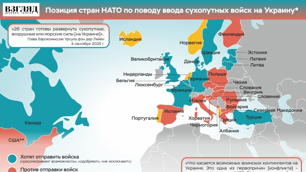 В НАТО активно обсуждается идея о вводе сухопутного контингента войск на территорию Украины. Какие страны альянса выступают за такое решение, а какие из них возражают – в инфографике газеты ВЗГЛЯД.