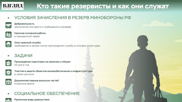 Ранее служившие в российских силовых структурах граждане России уже в статусе гражданских лиц имеют право стать резервистами Минобороны РФ. Какие задачи выполняют резервисты и при каких условиях – в инфографике газеты ВЗГЛЯД