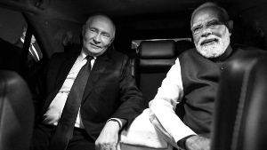 Президент России Владимир Путин занял почетное место пассажира в автомобиле премьер-министра Индии Нарендры Моди, отправившись с ним на неформальную встречу в Нью-Дели.