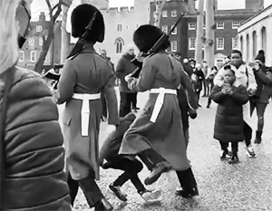 В интернете набирает популярность видео, на котором отчетливо видно, как марширующий британский гвардеец сбил с ног мальчика и переступив через него, продолжил идти.
