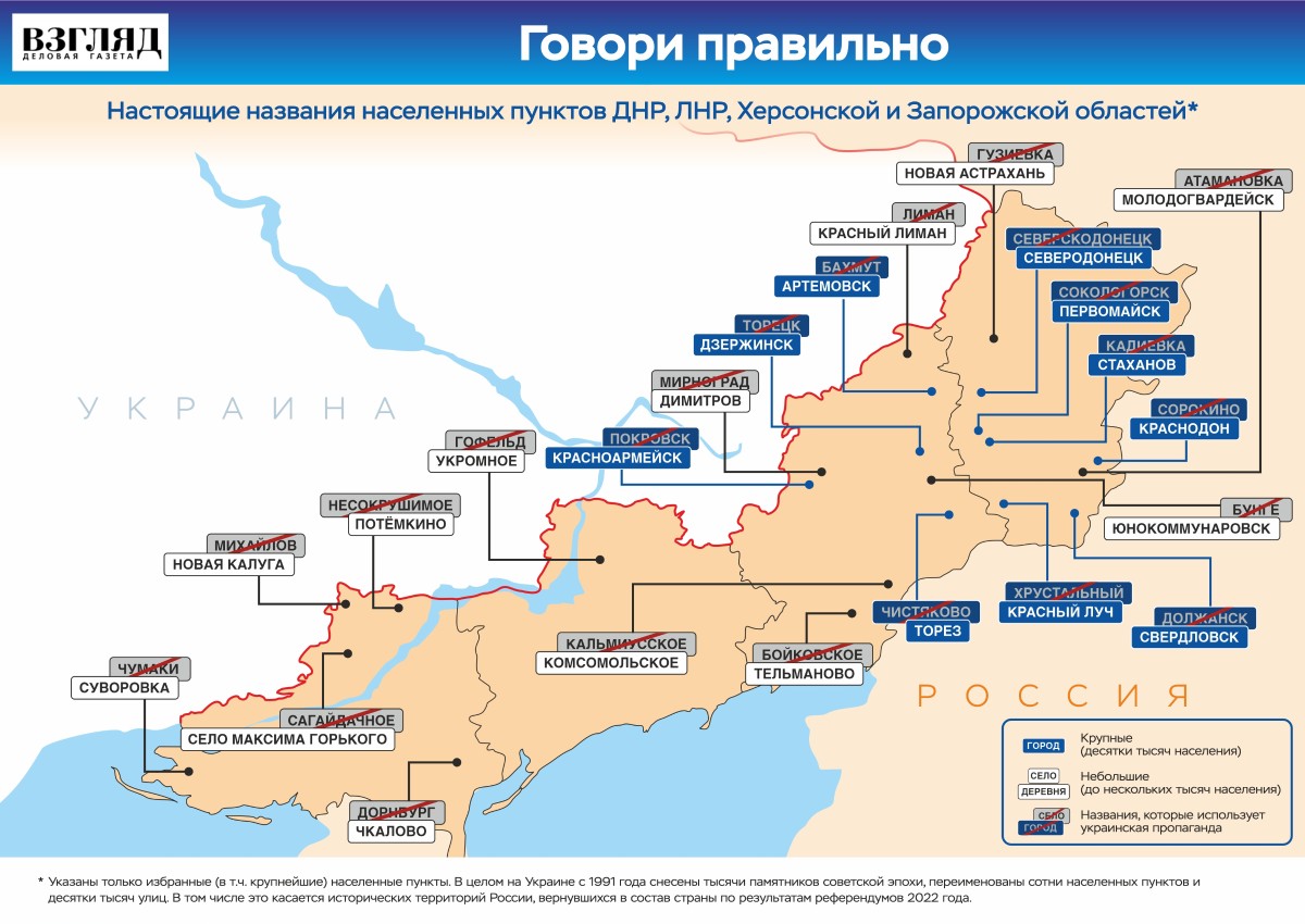 Он отмечал, что возвращение прежних русских названий городам, таким как Днепропетровск и Елизаветград, является правильным шагом.