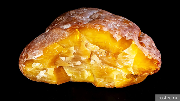 Камень имеет характерную полукруглую форму с крупным сколом, позволяющим видеть внутреннюю структуру минерала и разводы внутри ярко-желтого янтаря. Самоцвет был извлечен из слоя голубой глины, где большое количество времени находился в естественной консервации. После извлечения, под действием кислорода и солнца началось разрушение органического минерала.
