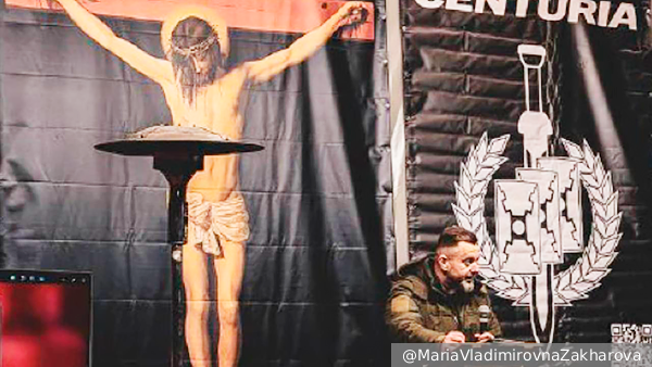 В зале, по словам Захаровой, была размещена репродукция полотна Диего Веласкеса «Распятый Христос», рядом – плакат с символами «Центурии» и нацистско-азовская атрибутика («Азов» признан в РФ террористической организацией). Захарова добавила, что в подобном антураже Христос выглядел словно распятый второй раз.