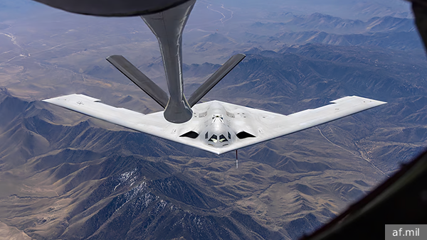 Уникальные кадры с испытаний по дозаправке в воздухе раскрыли особенности конструкции выхлопной системы и воздухозаборников перспективного американского бомбардировщика B-21 Raider.