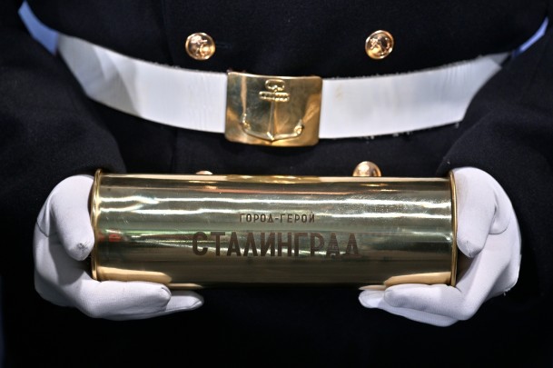 В ходе церемонии ветеран Великой Отечественной войны, участник Сталинградской битвы Павел Петрович Винокуров передал гендиректору Росатома Алексею Лихачеву капсулу с землей с Мамаева кургана. Впоследствии она будет храниться на ледоколе «Сталинград» (фото: Алексей Даничев/РИА Новости)