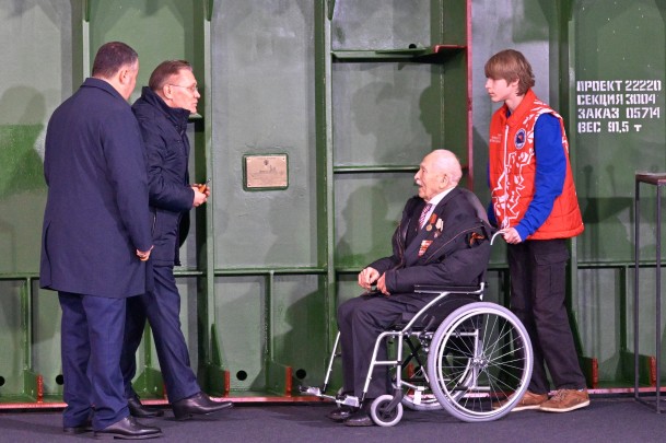 На Балтийском заводе в Санкт-Петербурге состоялась закладка шестого серийного универсального атомного ледокола «Сталинград». В церемонии участвовал президент России Владимир Путин и ветеран Сталинградской битвы Павел Петрович Винокуров (фото: Алексей Даничев/РИА Новости)