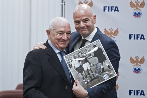 До конца своей жизни Симонян оставался в здравом уме и твердой памяти. Будучи первым вице-президентом Российского футбольного союза, он продолжал ходить на работу и посещать футбольные матчи. На фото: президент ФИФА Джанни Инфантино и Симонян в РФС (фото: Михаил Шапаев/РИА Новости)
