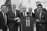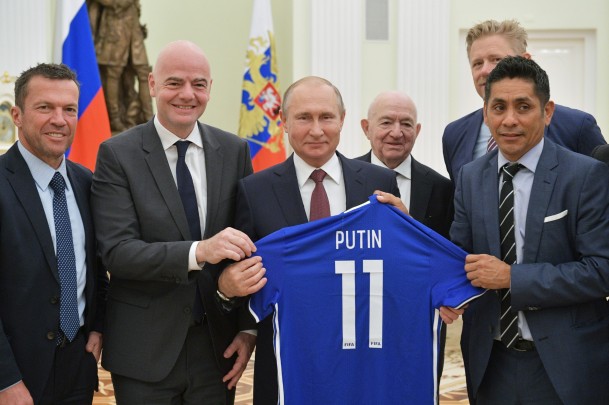 6 июля 2018 года, президент России Владимир Путин во время встречи с легендами мирового футбола. Слева направо: игрок сборной Германии Лотар Маттеус, Джанни Инфантино, Путин, Симонян и мексиканский футболист Хорхе Кампос (фото: Алексей Дружинин/РИА Новости)