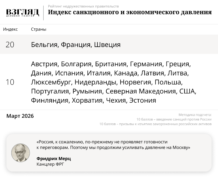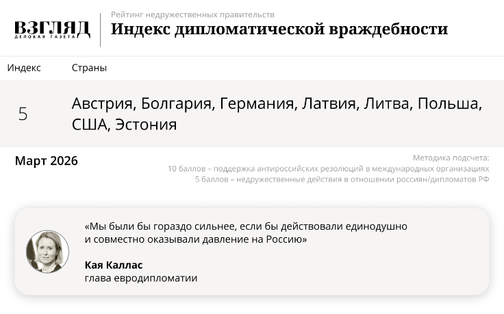 Газета ВЗГЛЯД выпустила «Рейтинг недружественных правительств» за март 2026 года. Безоговорочными лидерами в этом месяце стали страны Прибалтики и Финляндия. Такой результат объясняется качественным сдвигом в их действиях: теперь это не только поставки вооружений на Украину, но и возможное использование их территорий для ударов по России.